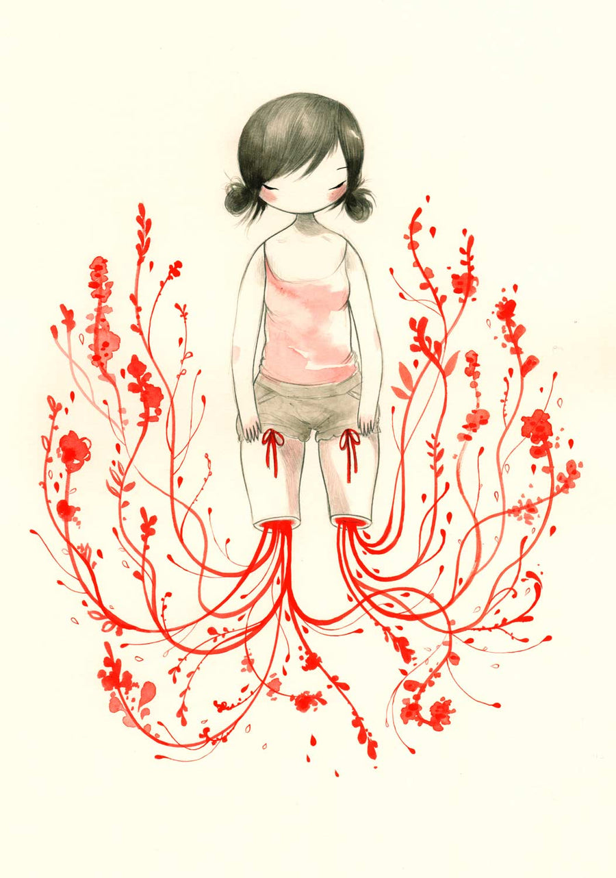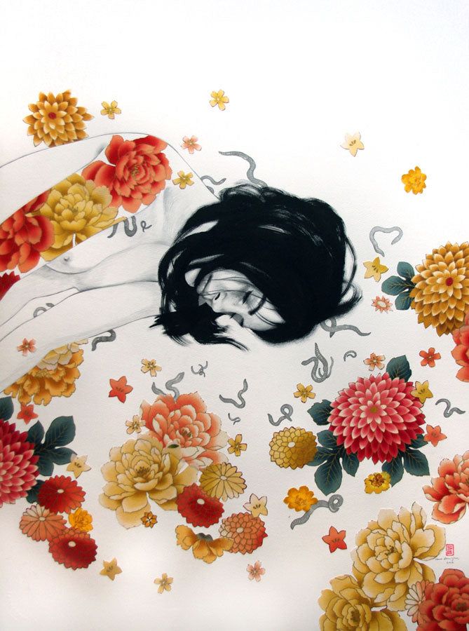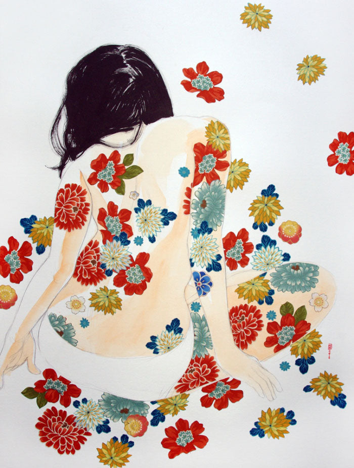 I reject the traditional figure-ground relationship, omit a horizon - even a ground line - and place my figures within a strictly 2-dimensional space. My girls are at once isolated in the center of their own universes - and interconnected to the smattering of floating, ephemeral objects by which they are surrounded. Loneliness is such a big deal to me. Everybody gets it. I am obsessed with skin -it’s this weird complex ugly beautiful bag which contains and separates ‘us’ from everything else. Body modification – specifically modifying the skin by inking or puncturing – is to redefine and rewrite our relationship with the world. I am interested in this artificial outline with which we separate ourselves from an imaginary exterior: this outline which separates person - from flower - from insect – from star – from me – and from you.