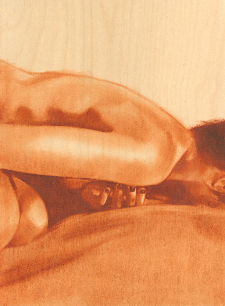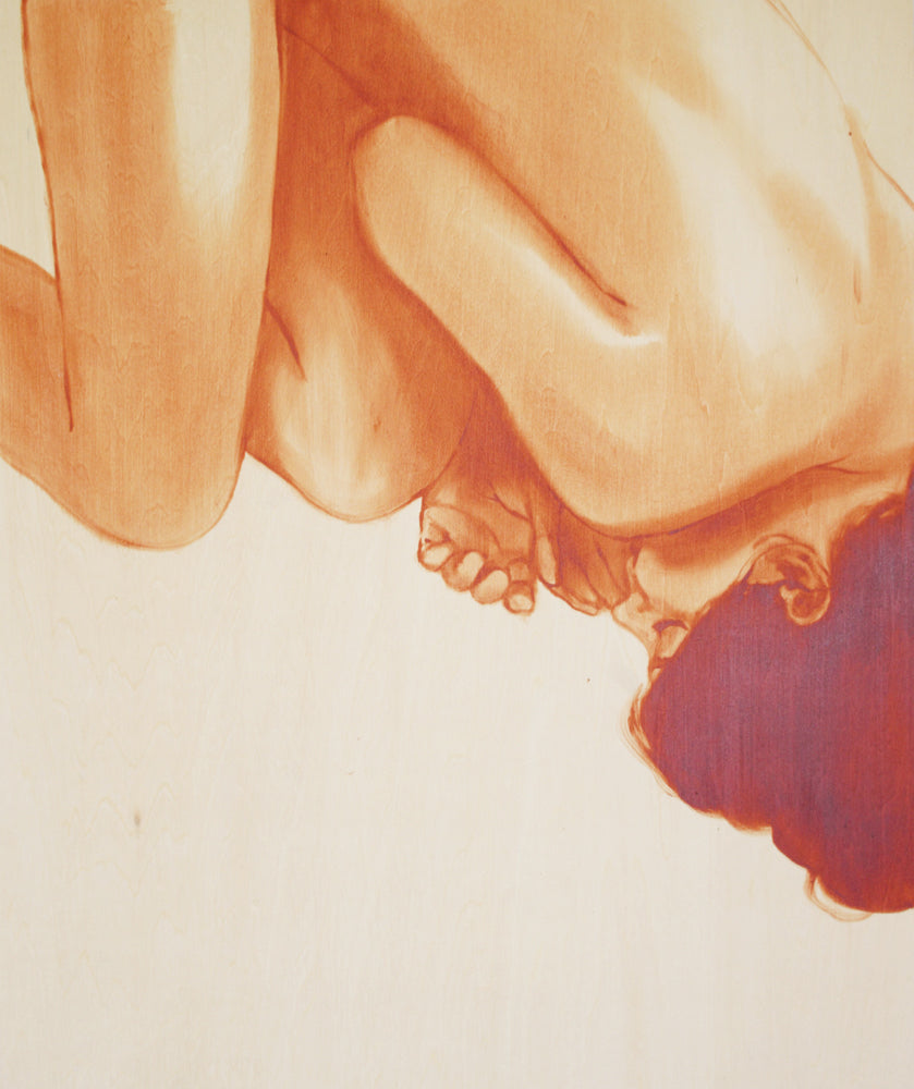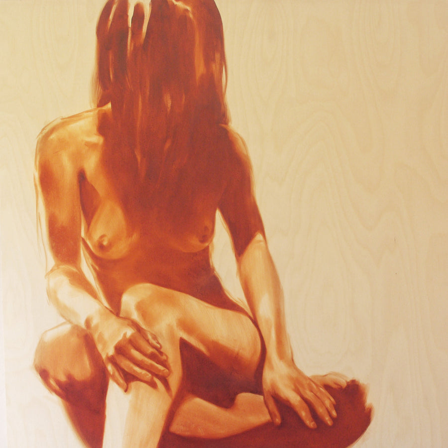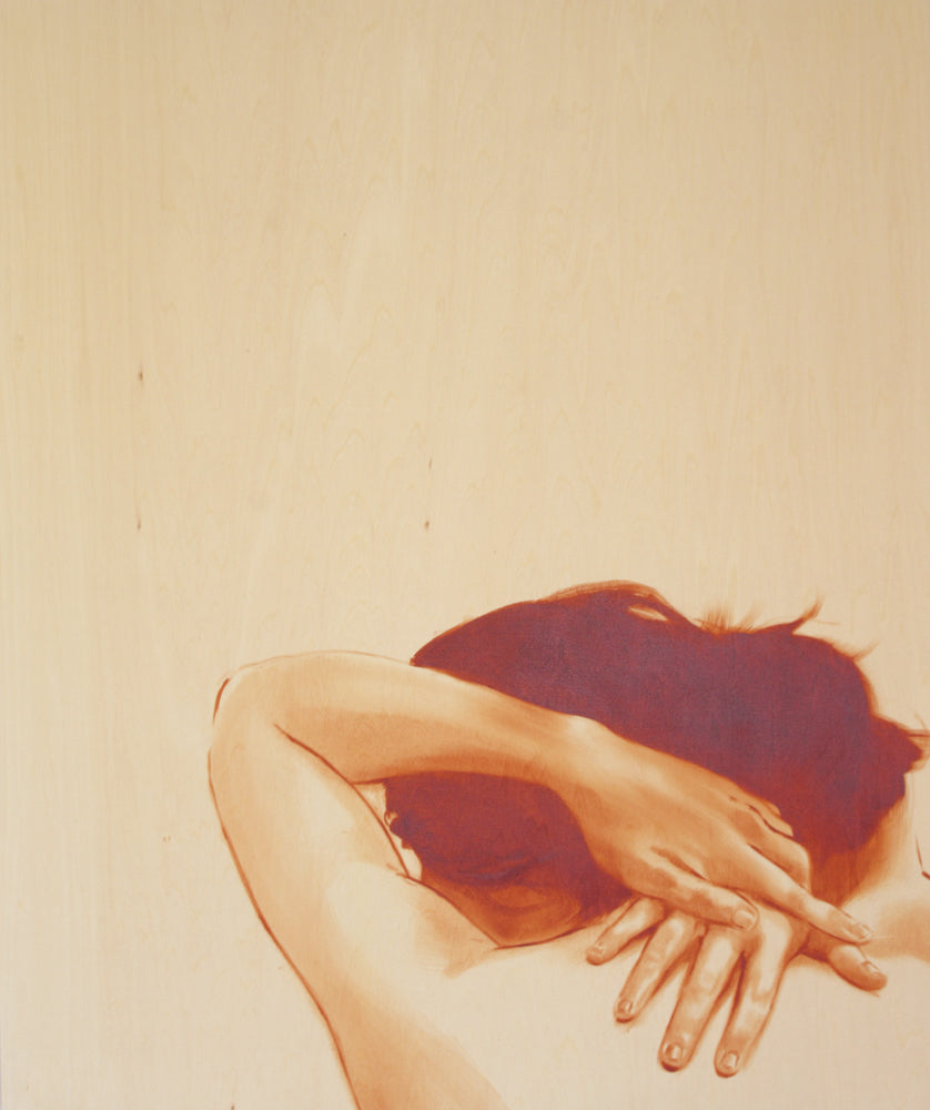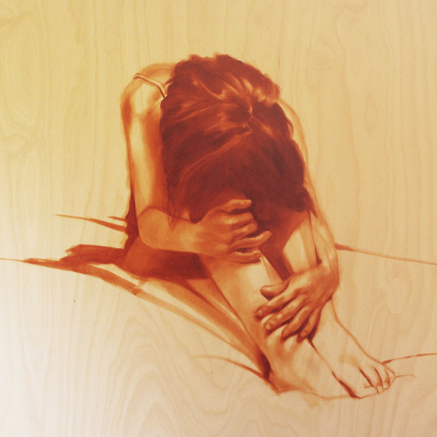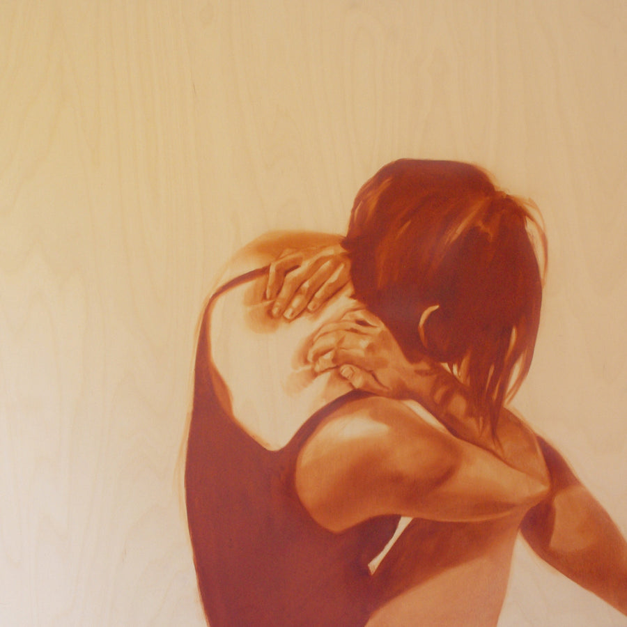 And I lay there, curled up, feeling what it's like to be in this body. I always liked sleeping in, but had never appreciated it this much. It occurs to me that there are emotional crashes, and those can also stick you with whiplash. I feel residual sadness, and like with my physical injury I don't do my exercises even though I should, cuz it hurts. So this art is my way of tugging at old wounds, stretching out and gnawing over old heartbreak and disappointment, using vague images of my body as the language. The materials are simple, and straightforward: one color of oil paint on bleak birch panels. I'm trying to create a portrait of longing, of a fleeting, anonymous stillness. I am remembering sadness.
