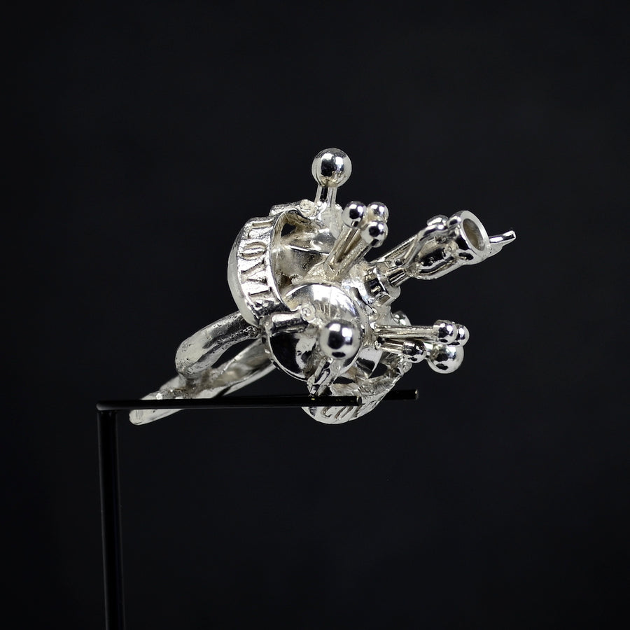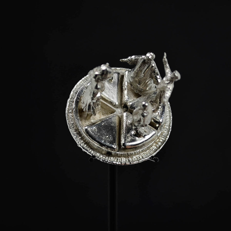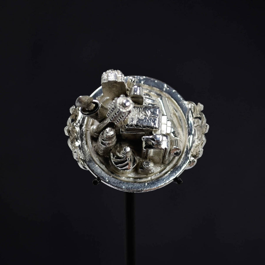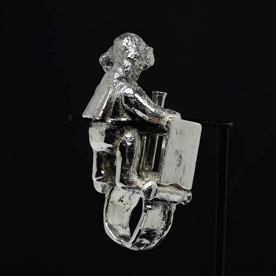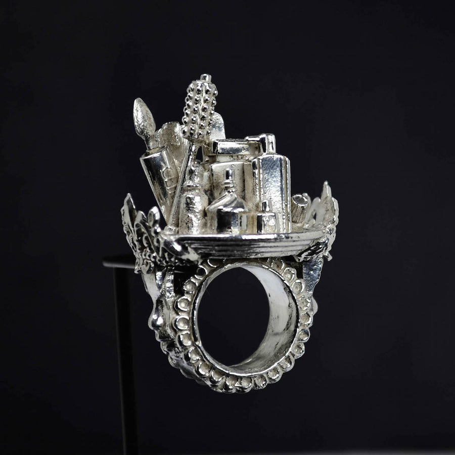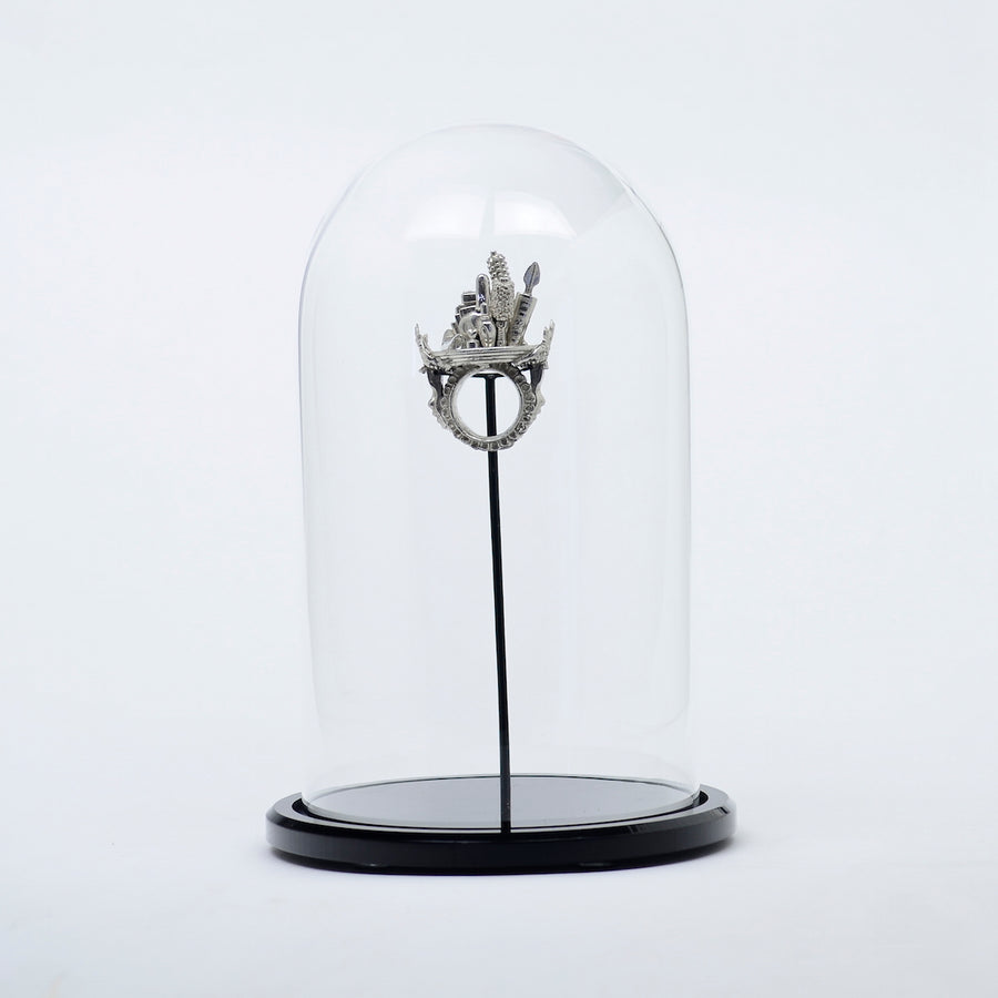 Each piece is shown with magnifying glasses and its own professional display which frames and finishes the ring, offering the wearer the option to enjoy it as a ring as well as a standalone sculpture in its display when not worn. A hand blown glass cloche dome, black acrylic base, and armature, underneath the base, a circular aluminum plate is engraved with the piece’s title, medium, weight, artist signature and year. In addition, the signed, fingerprinted, numbered, and dated documentation for provenance (including piece specifics, exhibitions list, etc.), completes each ring as a fully realized work of art, from conception to execution.